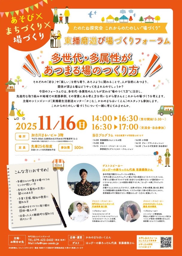 多世代・多属性の人たちと地域が交わり、つながる場や機会をどうすれば東播磨地域にひろげていくことができるか、先進的な取り組み事例やその背景にある考え方を聞き、遊び場や人があつまりつながる場をみんなで考えるフォーラムを今年も開催します!